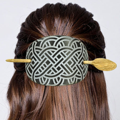 Leather Hair Barrette – Celtic, Hand-Painted in Silver with Oak Stick