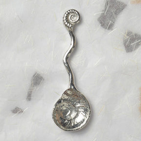 This exquisite little pewter spoon has a beautifully detailed shell bowl and an ammonite on the end of a curvy shaped handle.