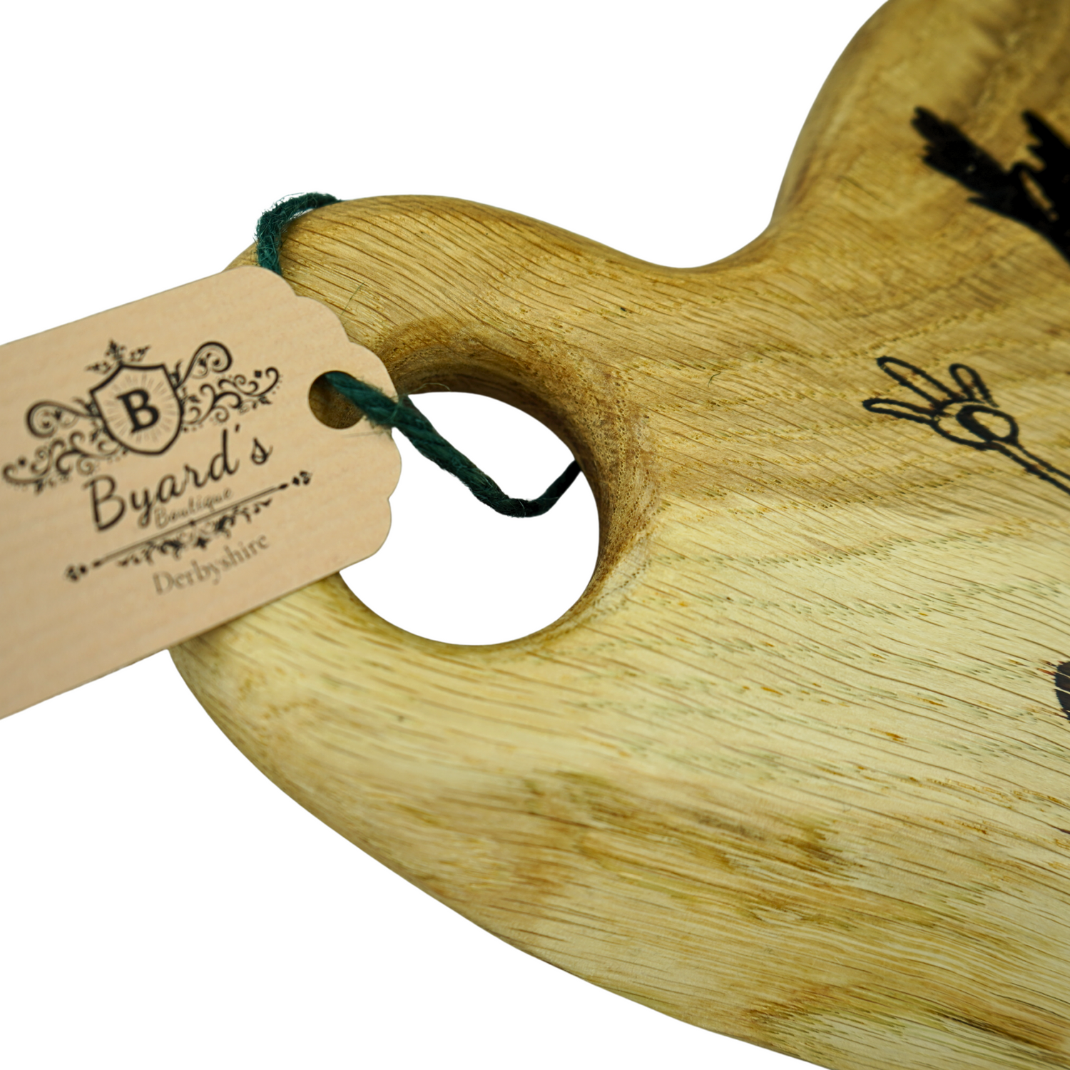 Featuring a natural wainy edge that highlights the oak’s organic beauty, these boards are adorned with a finely laser-engraved design for a touch of artistry. Each is meticulously finished with food-safe danish wood oil, enhancing the wood’s character while ensuring lasting durability.