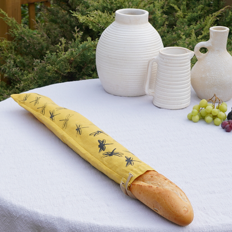 Linen Baguette Bag – Dragonfly Hand Printed French Stick Bread Bag Mustard