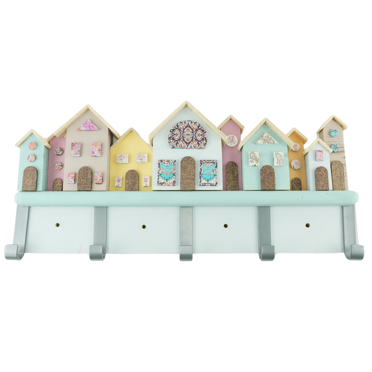 Bring charm and functionality to your home with this delightful handcrafted coat hook rack, featuring a row of colorful little houses perched on top. Each house is beautifully detailed with decoupage windows and doors, creating a whimsical miniature village scene in soft pastel hues.