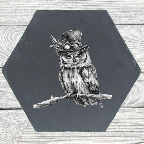 Regular price £12.50Unit priceUnavailableHexagonal Natural Slate Placemat – 26cm (Steampunk Owl Engraving)