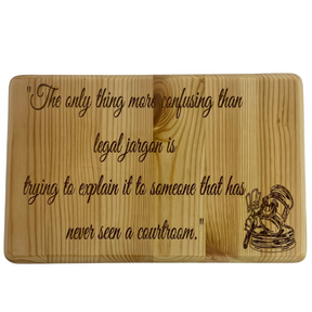 Bring humour and charm to your home or office with our laser-engraved wooden sign, handcrafted with care in Derbyshire, England. Perfectly crafted, it features the legally inspired phrase: 'The only thing more confusing than legal jargon is trying to explain it to someone that has never seen a courtroom.'