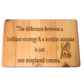 Bring humour and charm to your home or office with our laser-engraved wooden sign, handcrafted with care in Derbyshire, England. Perfectly crafted, it features the legally inspired phrase: 'The difference between a brilliant strategy & a terrible mistake is just one misplaced comma'