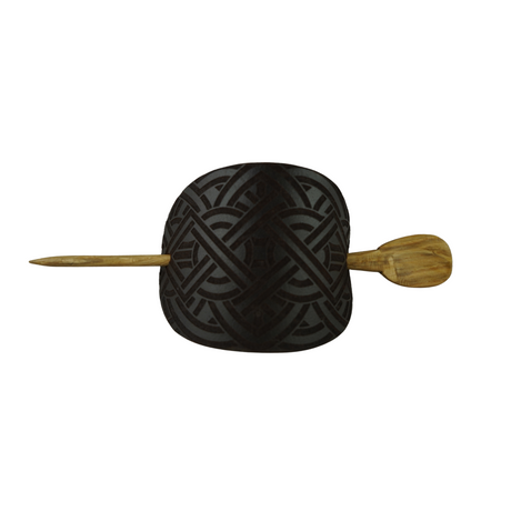 Handcrafted Leather Hair Barrette – Celtic Design on Black Leather with Oak Stick