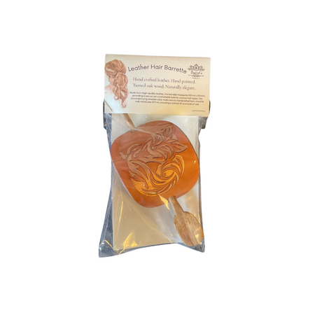 Handcrafted Leather Hair Barrette – Bronze Kingfisher on Tan Leather with Oak Stick