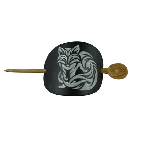Handcrafted Leather Hair Barrette – Silver Fox on Black Leather with Oak Stick