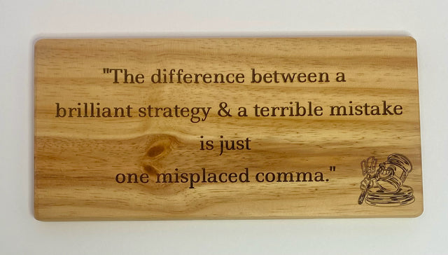 Bring humour and charm to your home or office with our laser-engraved wooden sign, handcrafted with care in Derbyshire, England. Perfectly crafted, it features the legally inspired phrase: 'The difference between a brilliant strategy & a terrible mistake is just one misplaced comma'